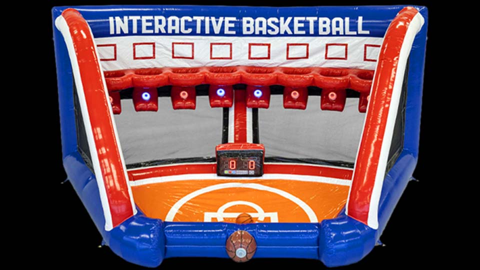 Our Basketball Multiplayer Inflatable Game is 2 to 4 players, has electronic scoring, colored lights under the rims, and colorful graphics. Our basketball inflatable challenge game is 9′ tall so it will work both outdoors and inside most venues. Our inflatable basketball game offers an exciting spin on basketball. Under every basket there is a colored light that randomly changes to red or green. Each team has a colored spot for their team, red or green. Each team must try to score in the basket with the correct color, but the colors randomly change! Make the shot when it is your color to score points, but if the color changes you scored for the opposing team. Play 1 on 1, 2 on 1, or 2 on 2. This is a great game for guests that have seen it all. Get as many points as possible and defeat your opponent. Each game is 45 seconds and is very challenging. After the game is over it will announce if the red or green team won. Click the link to see more basketball games.