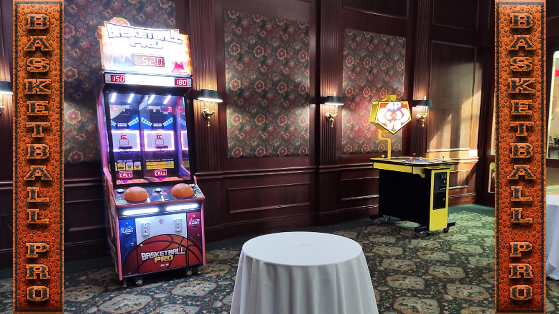 Super Easy To Play, 1 Or 2 Players Compete By Pounding The Soft Basketball Controllers To Shoot The Tiny Basketballs At The Hoop. The Harder They Hit, The Farther The Ball Travels! Moving Backboards Adds To The Challenge. 3 Points Awarded Per Basket, And 6 Points Awarded Per Basket In The Final 10 Seconds. Make As Many Shots As You Can Before Time Runs Out. Red Numerical LED Displays Show The Shot Clock. Fully Enclosed Play Area Keeps The Mini-Balls From Being Lost Outside Of The Game. LED Color Changing Lights Look Great And Allow Guests To Play In The Dark. Basketball Pro is a modernized version of the classic Atari game, Hoop It Up, which we also have for rent. Basketball Pro uses miniature basketballs, and Hoop It Up uses ping pong balls.