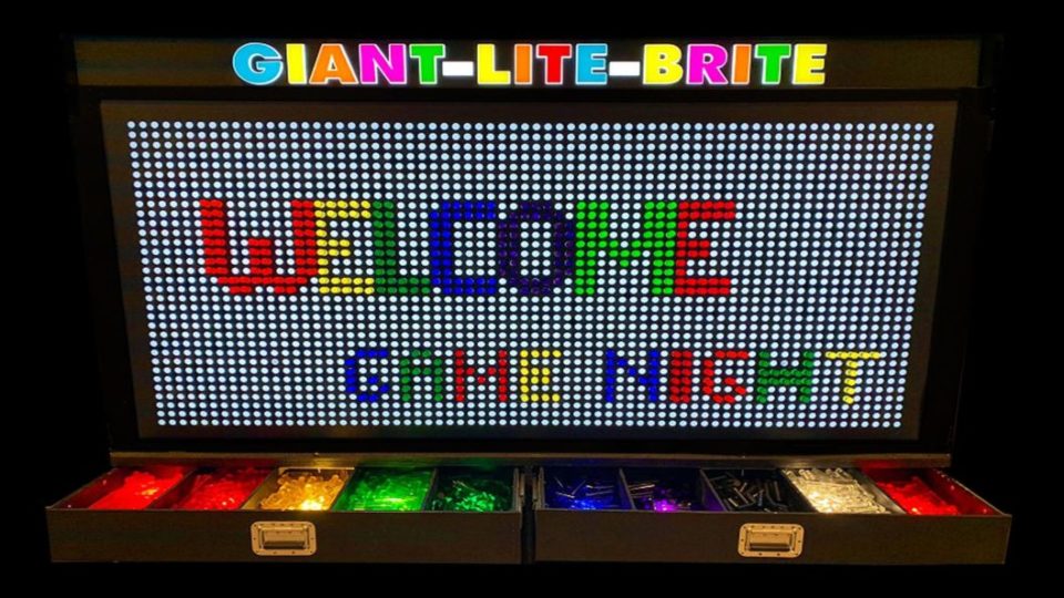 Our New Custom Giant Lite Brite (Light Bright) Is The Biggest And Best Version Anywhere! We Designed It With An Illuminated Sign On Top And Illuminated Drawers To Make It Easy To Choose All 10 Colors In The Dark. Our Lite Brite Is Built At Table Height With Locking Wheels And Illuminated Drawers For All 10 Color Pegs, So Unlike The Competition, We Do Not Need To Use A Table, Table Cloth, Or Plastic Rubbermaid Trays For The Pegs. Most Companies Provide 6-8 Peg Colors, We Provide 10. Our Lite Brite Makes Set Up Quick, Neat, And Easy To Move From The Cocktail Hour Room To The Main Party Room. Dimensions 8’2″W X 6’8″H X 30″D