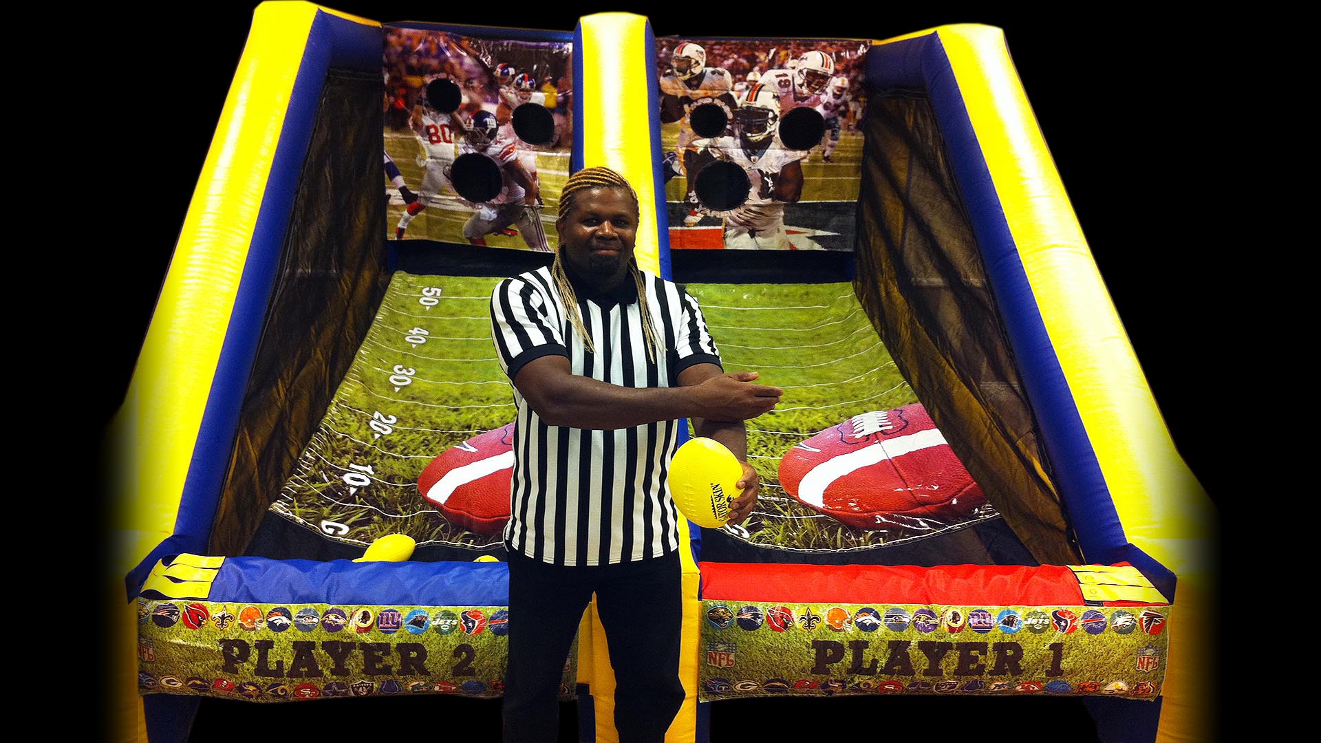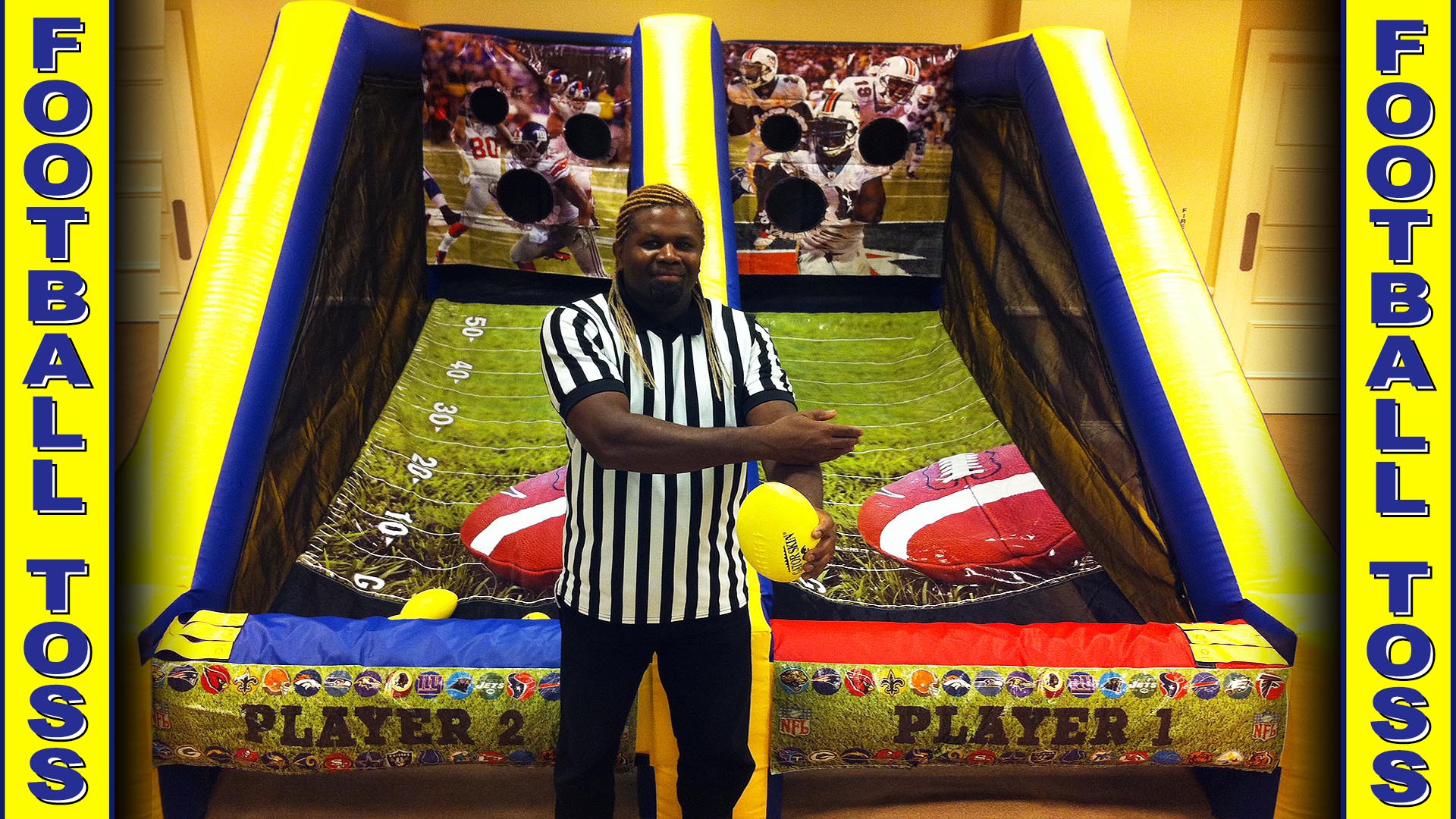 This New Inflatable Football Version Of The Popular Basketball Pop-A-Shot Is A 2-Player Head-To-Head Football Toss Game. Who Can Make More Winning Passes? Custom Background Artwork Has NY Giants Vs. Miami Dolphins. Dimensions: 13’W X 12’L X 7’11″H 75 Lbs.