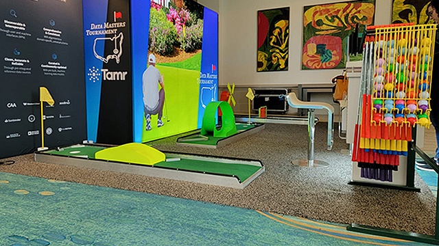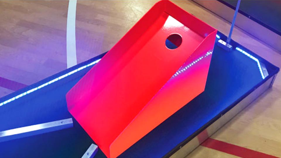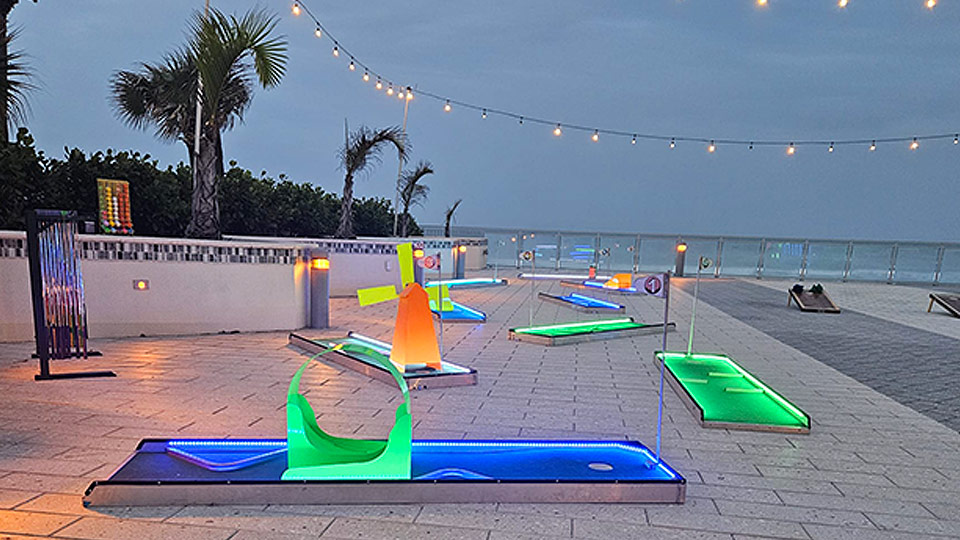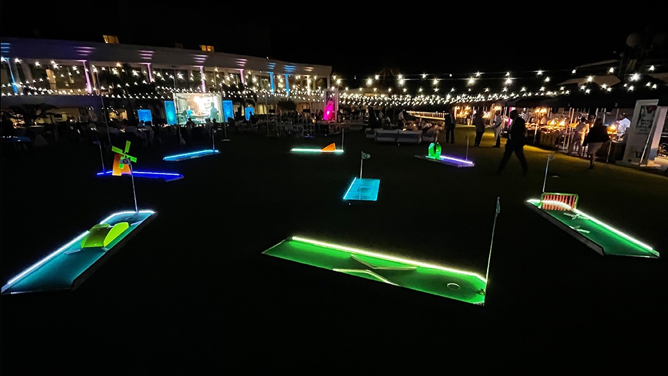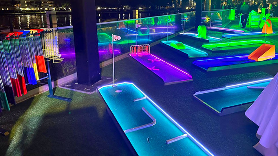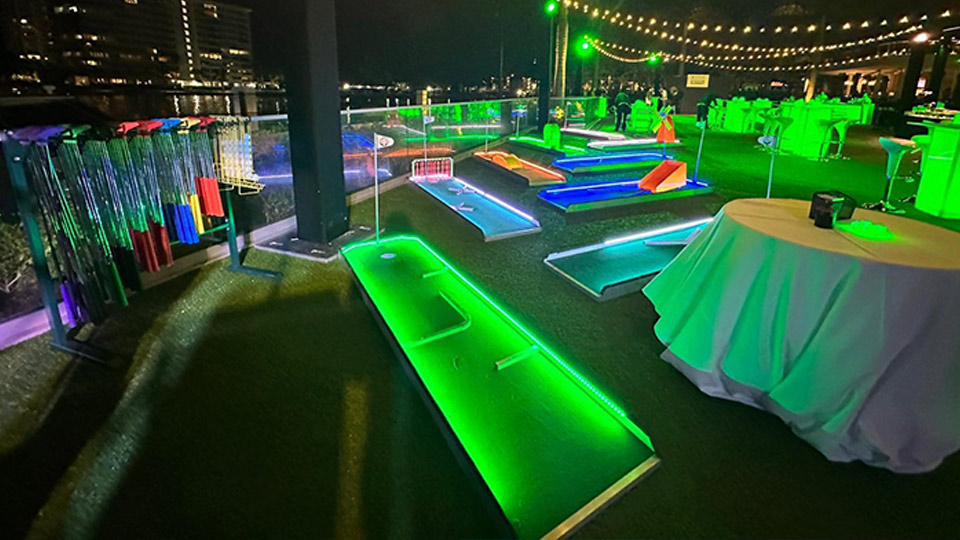Our Miniature Golf Game Rental can be rented as a 3, 6, or 9 Hole course. Rentals include 3, 6, or 9 mini golf holes, golf putters, golf balls, flags, scorecards, and pencils. Set up takes 20-30 minutes with our custom made mobile golf course storage carts that make transporting them a breeze. Our golf courses are made of thick gauge aluminum that will withstand guest abuse. Cheaper party rental golf courses are either inflatable (wrinkled, uneven courses that you can’t stand on) or portable wood courses that rot, chip, or crack, and constantly need to be repainted. Our aluminum frames do not rust and do not need to be painted. This game can be rented with or without color changing LED lights! Click here for more golf rental games.