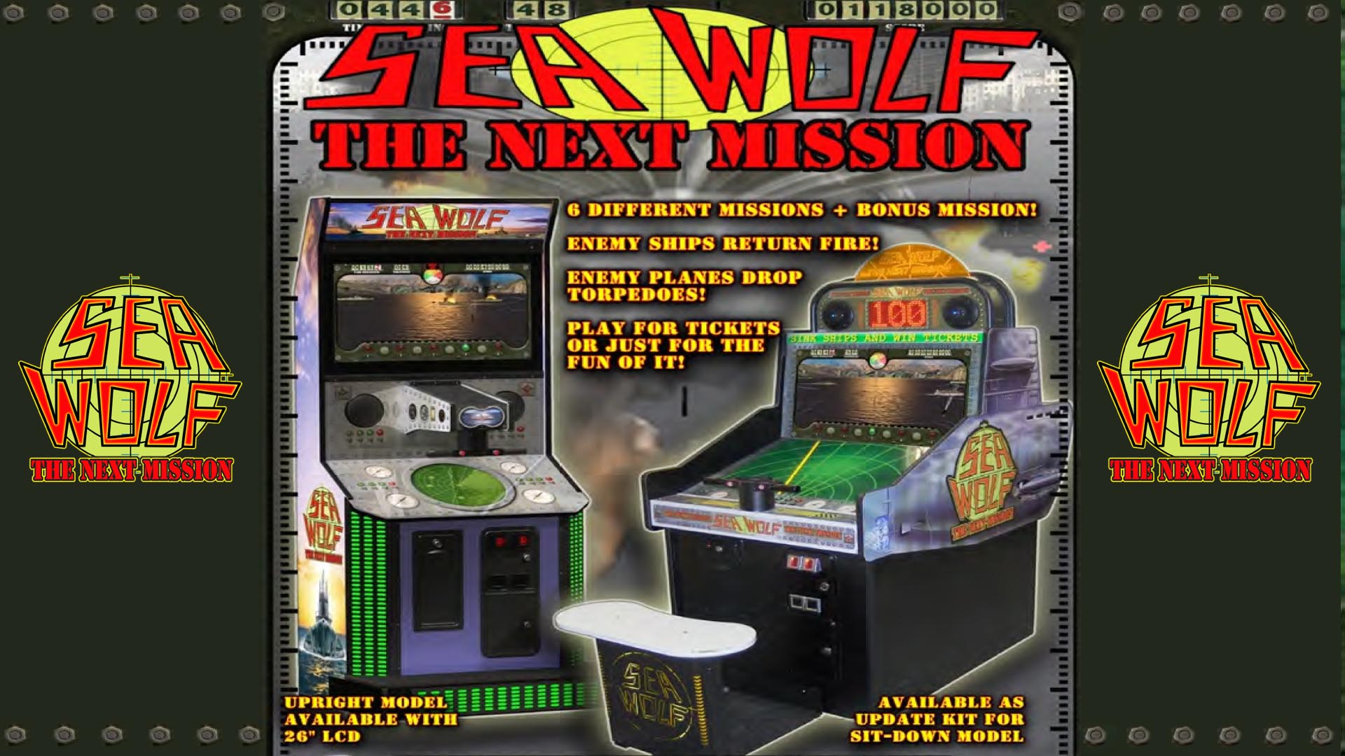 Sea Wolf Is A Remakes Of The 1976 Arcade Classic, Sea Wolf, By Midway. This Unique Submarine Battle Simulator Has Updated Graphics And Sound With Realistic Enemy Boats That Criss-Cross The Water From Either Side Of The Screen. Your Goal Is To Aim Your Periscope And Take Out As Many Boats As Possible Before The Timer Or Your Torpedos Run Out. If You Suceed You’ll Move On To The Next Mission! (7 Total Missions). Dimensions 80″H X 33″W X 29″D, 350 Lbs.