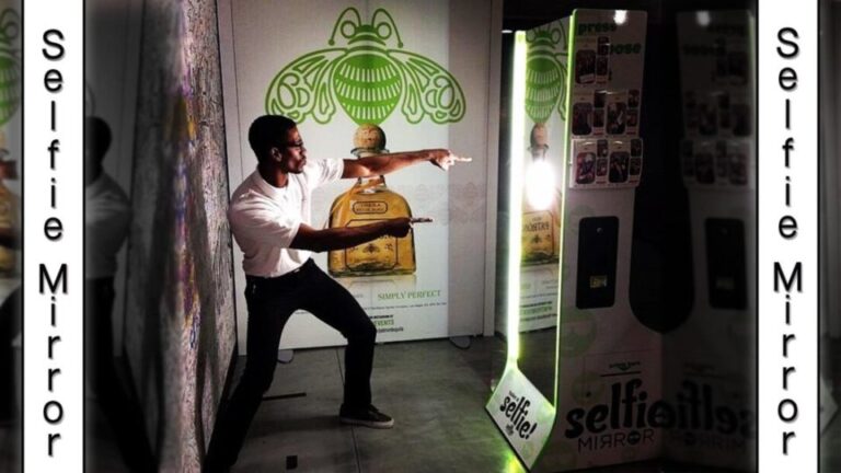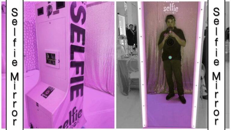 The Selfie Mirror Photo Booth is a life-size 7′ mirror with LED lights that takes your photo!